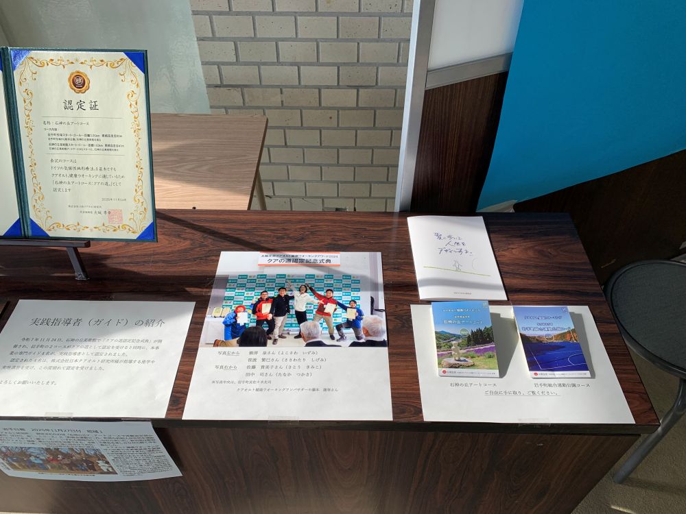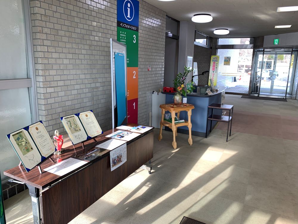 岩手町役場のロビーに、クアオルト健康ウオーキングのスタートを紹介する展示コーナーが設けられています。
